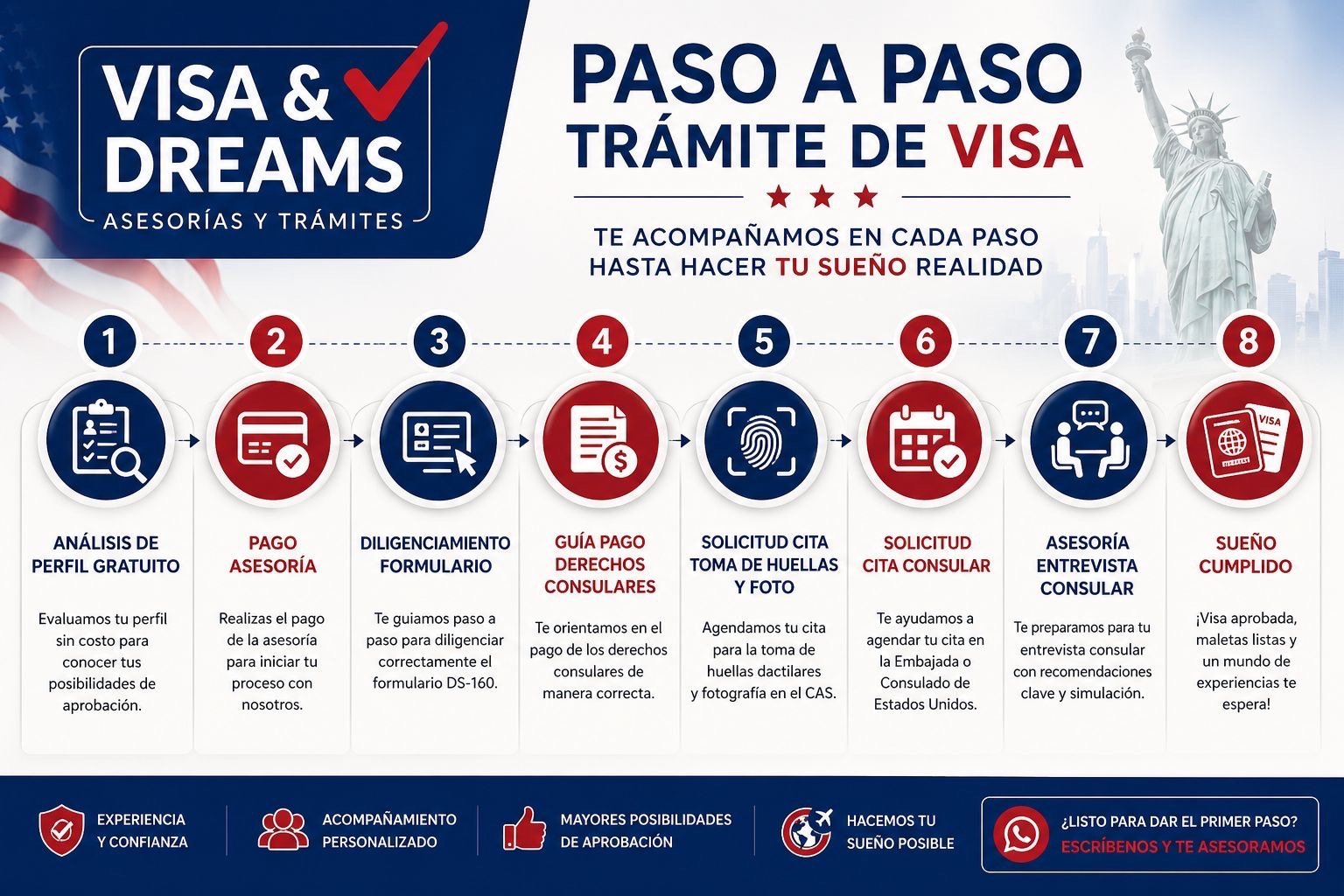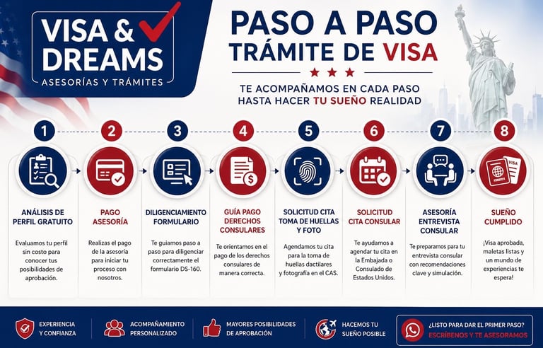 Perfilamiento experto, diligenciamiento de DS-160 y preparación completa para sus citas consulares.